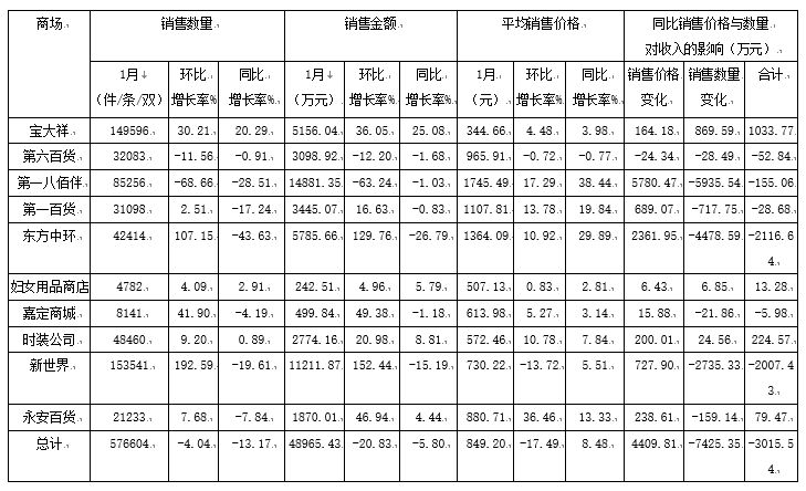 上海服装行业协会网络信息定期统计报表显示,1月份上海十大商场服装大类商品总体共销售57.66万件,环比上月减少2.43万件,环比下降4.04%;销售数量同比减少8.74万件,同比下降13.17%。1月份服装大类商品共销售4.90亿元,环比上月减少1.29亿元左右,环比下降20.83%;销售额同比减少0.30亿元,同比下降5.80%。本月平均销售价格为849.20元/件,环比上月下降17.49%,同比上升8.48%。从1月份上海服装行业协会网络信息资料看,尽管在春节新年促销的大背景下,但由于受到互联网销售的冲击,实体销售服装数量和金额与上月和去年同期相比均下降。