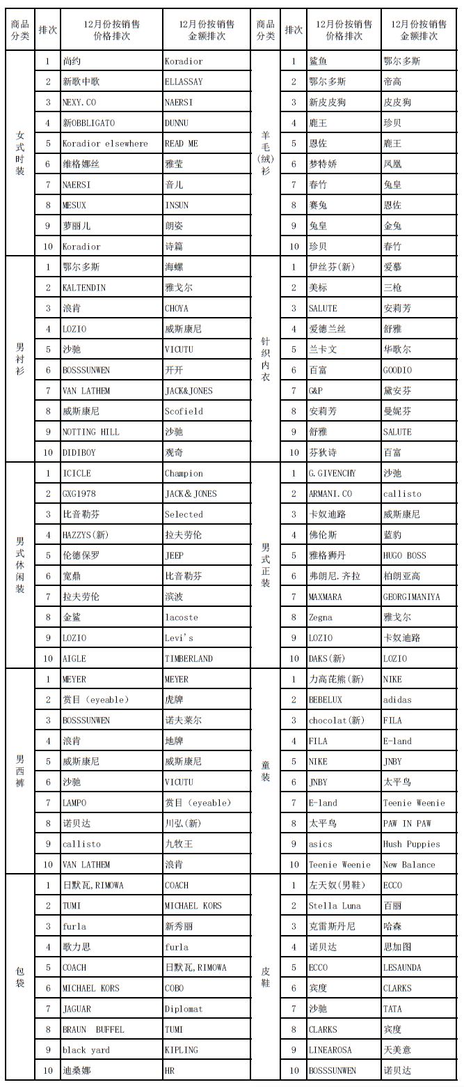 2019年1月份上海服装行业协会网路信息分类销售情况分析表