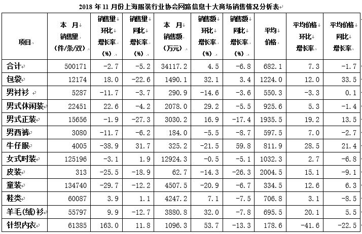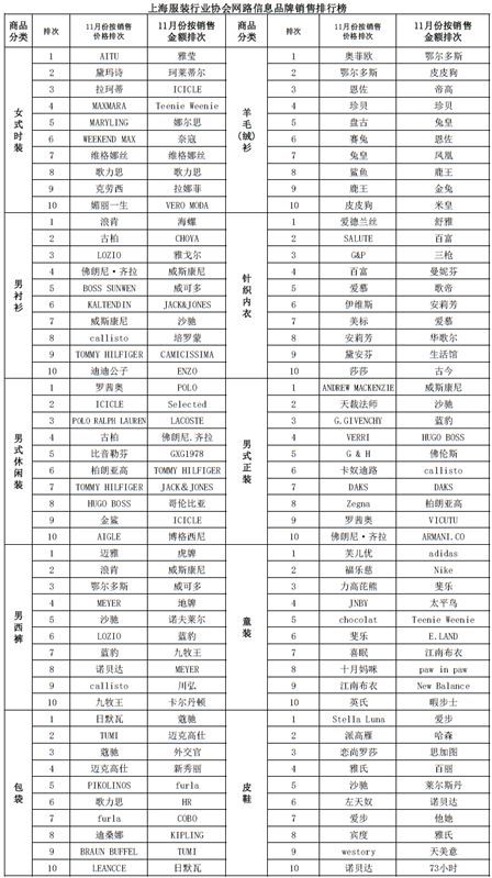 上海服装行业协会网络信息定期统计报表显示,11月份上海十大商场服装大类商品总体共销售50.0万件,环比上月减少1.4万件,环比下降2.7%;同比减少2.7万件,同比下降5.2%。11月份服装大类商品共销售3.41亿元,环比上月0.14亿元左右,环比增长4.4%;销售额同比减少0.25亿元,同比下降6.8%。本月平均销售价格为681.8元/件,环比增长7.3%;同比下降1.8%。从11月份上海服装行业协会网络信息资料看,上海市中心区域的传统服装销售商场全面进入秋冬换季社会服装消费的复苏期,服装品牌结构的演变与社会消费价值观的磨合日趋激烈和白热化。二、上海服装行业协会网路信息销售品牌排行榜