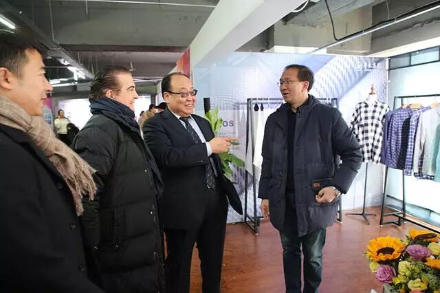 沈阳服装(服饰)行业协会娄敬洪会长陪同意大利时尚产业联合会驻华代表、国际著名服装设计师、品牌运营师弗朗西斯在参观鲁泰的展位。