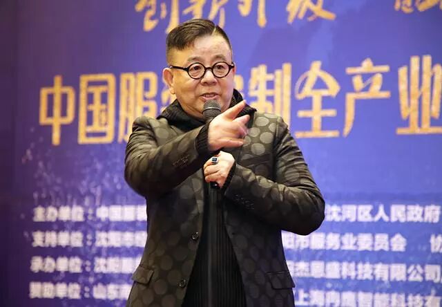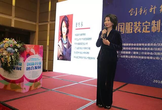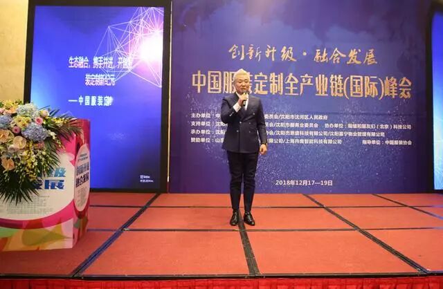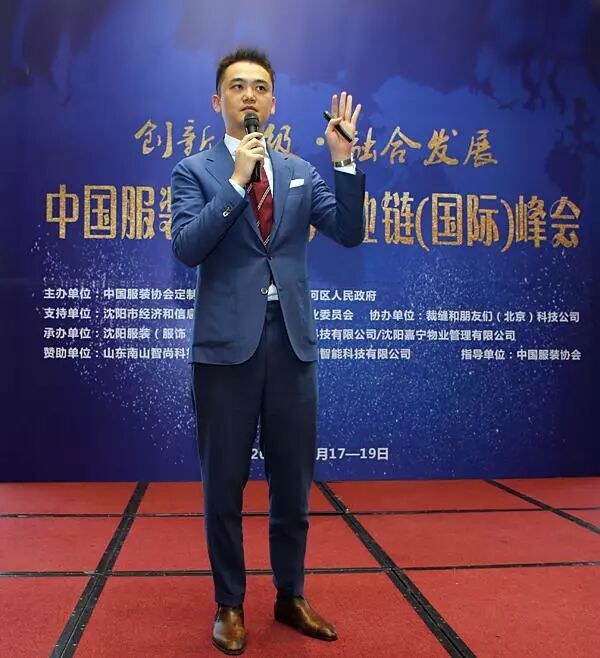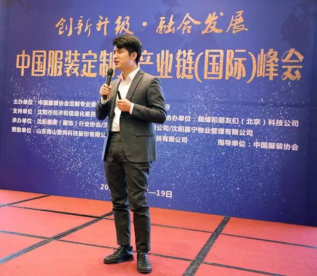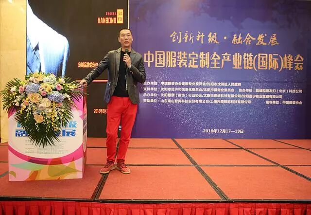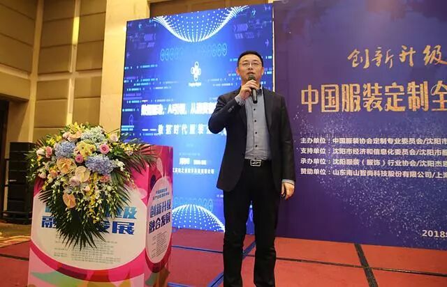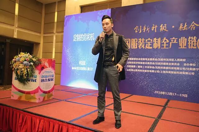 中国服装协会定制专业委员会副主任委员、沈阳杰恩盛科技有限公司董事长邵宏杰做第一个创新成果的演讲发布,