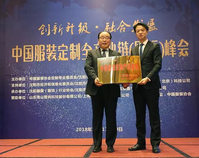 中国服装协会常务副会长杨金纯宣布并向基地的主办单位----沈阳服装(服饰)行业协会颁发了“中国服装定制产业基地”的命名牌匾;
