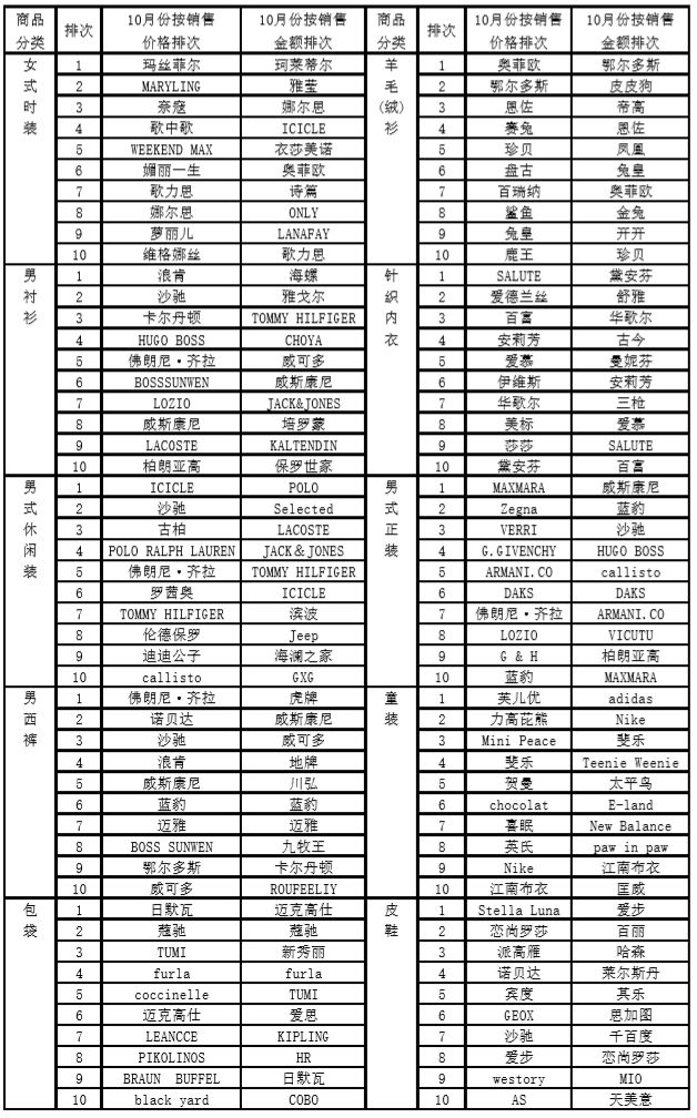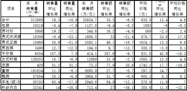 上海服装行业协会网络信息定期统计报表显示,2018年10月份上海十大商场服装大类商品总体共销售51.4万件,环比上月增加8.3万件,环比增长19.3%;同比减少6.3万件,同比下降10.9%。10月份服装大类商品共销售3.27亿元,环比上月0.85亿元左右,环比增长35.3%;销售额同比减少0.24亿元,同比下降6.8%。本月平均销售价格为635.5元/件,环比增长13.4%;同比增长4.6%。从10月份上海服装行业协会网络信息资料看,上海市中心区域的传统服装销售商场全面进入秋季社会服装消费的复苏期,服装品牌结构的演变与社会消费价值观的磨合日趋激烈和白热化。