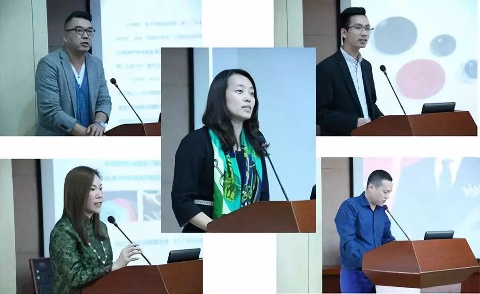(左上:衣得体信息科技有限公司市场部经理居嘉正、左下:上海依缇数码科技有限公 司总经理杨欣、中间:上海工程技术大学党委书记袁蓉、右上:泉州颖新高级定制纽总经理黄清源、右下:江苏永坤毛纺有限公司总工程师吕忠元)