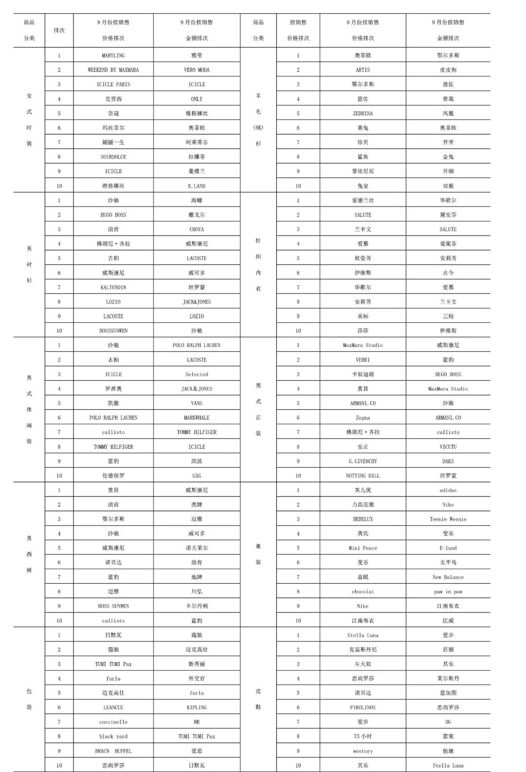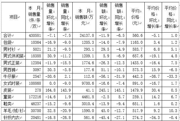 上海服装行业协会网络信息定期统计报表显示,2018年9月份上海十大商场服装大类商品总体共销售43.1万件,环比上月减少3.3万件,环比下降7.1%;同比减少3.5万件,同比下降7.5.%。9月份服装大类商品共销售2.41亿元,环比上月减少0.33亿元左右,环比下降11.9%;销售额同比减少0.17亿元,同比下降6.5%。本月平均销售价格为560.6元/件,环比下降5.1%;同比增长1.0%。从9月份上海服装行业协会网络信息资料看,上海市中心区域的传统服装销售商场全面进入秋季社会服装消费的复苏期的前夜,服装品牌结构的演变与社会消费价值观的磨合日趋激烈和白热化。