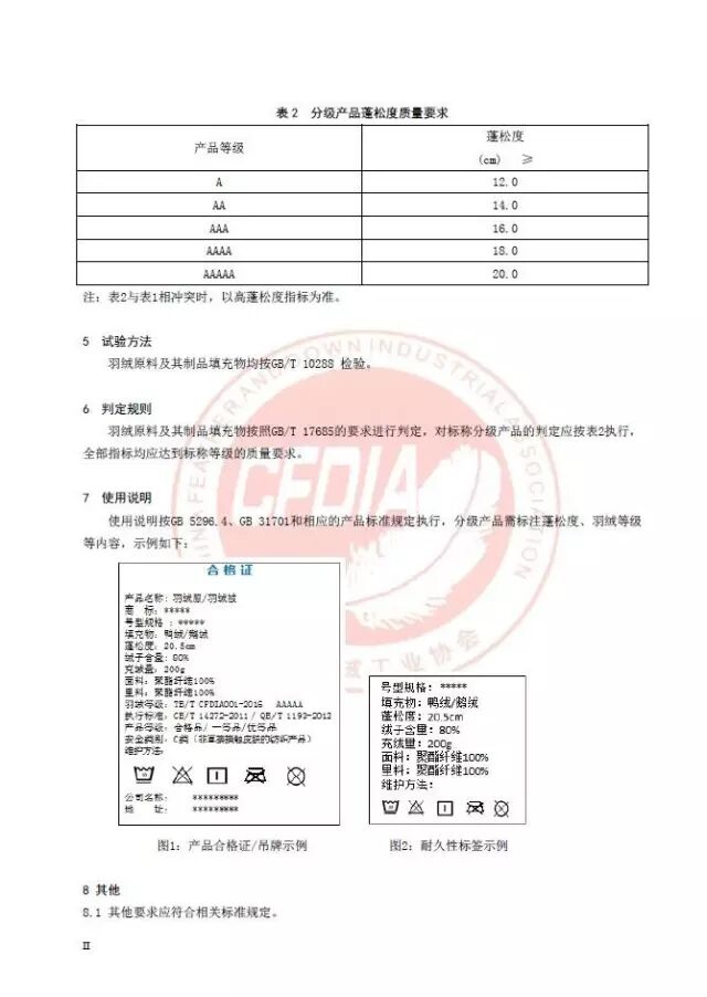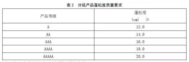 《标准》在羽绒及制品符合国家或行业现行标准的基础上,对羽绒蓬松度提出更高要求,依据蓬松度将羽绒划分为“A”-“AAAAA”五个等级。以蓬松度作为羽绒等级划分的原则,是因为蓬松度是衡量羽绒性能的关键指标,而且蓬松度的检测误差相对较小,容易掌握。《标准》要求将蓬松度体现在产品合格证/吊牌和水洗唛上,希望借此向客户及消费者宣导蓬松度的重要性,并以实际等级指导采购和消费,体现优质优价原则。