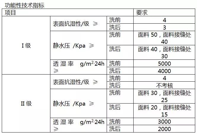 顾名思义。首先,用于冲锋衣的面料,必须具有防水透湿功能;再者就是服装的穿着条件是用于户外运动。户外运动分为专业运动和休闲运动,所以此标准在功能性技术要求方面,将户外专业运动定义为I级,将户外休闲运动定义为II级。专业运动技术要求高于休闲运动。