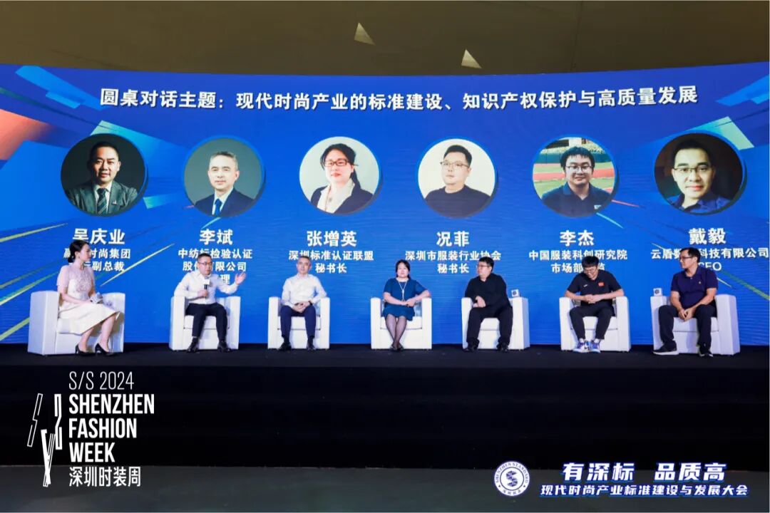 随后的圆桌对话环节,深圳标准认证联盟秘书长张增英、深圳市服装行业协会秘书长况菲、中纺标检验认证股份有限公司总经理李斌、中国服装科创研究院市场部总监李杰、赢家时尚集团执行副总裁吴庆业、云盾数据科技有限公司CEO戴毅六位嘉宾围绕现代时尚产业的标准建设、知识产权保护与高质量发展话题展开深入的交流与对话。