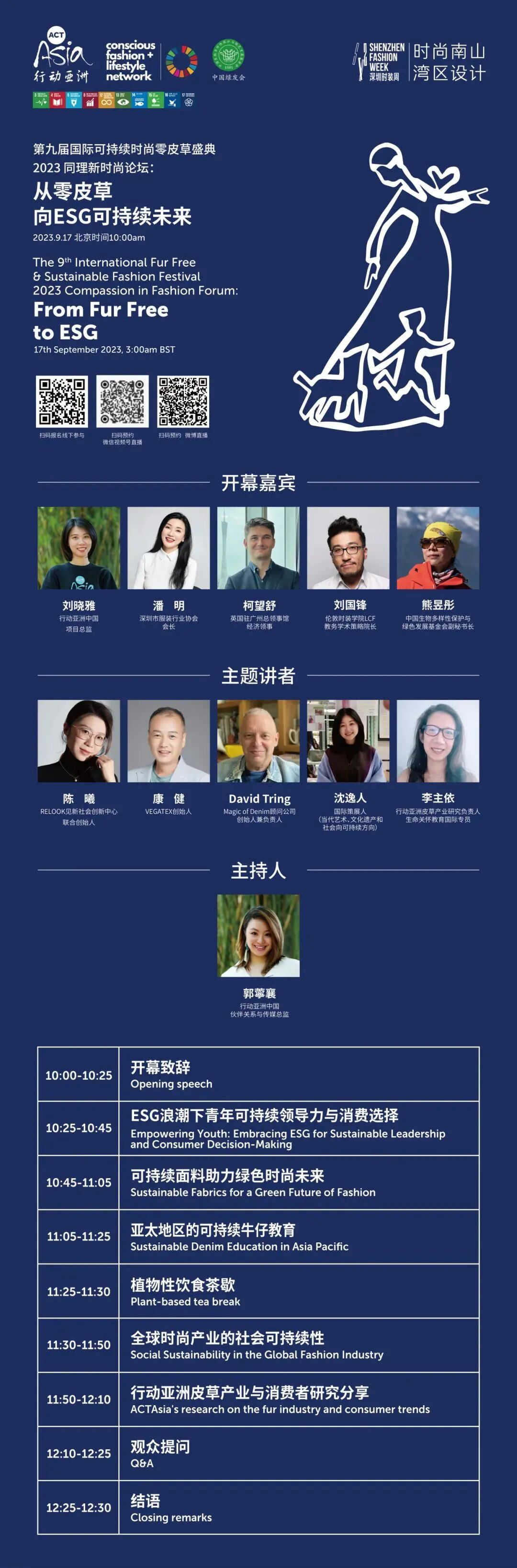 9月17日上午10点,深圳时装周与行动亚洲将于深圳欢乐海岸创展中心联合举办S/S 2024 深圳时装周 & 第九届国际可持续时尚零皮草盛典之“2023 同理新时尚论坛:从零皮草向ESG可持续未来”,揭秘与解构ESG视角下的零皮草可持续未来。