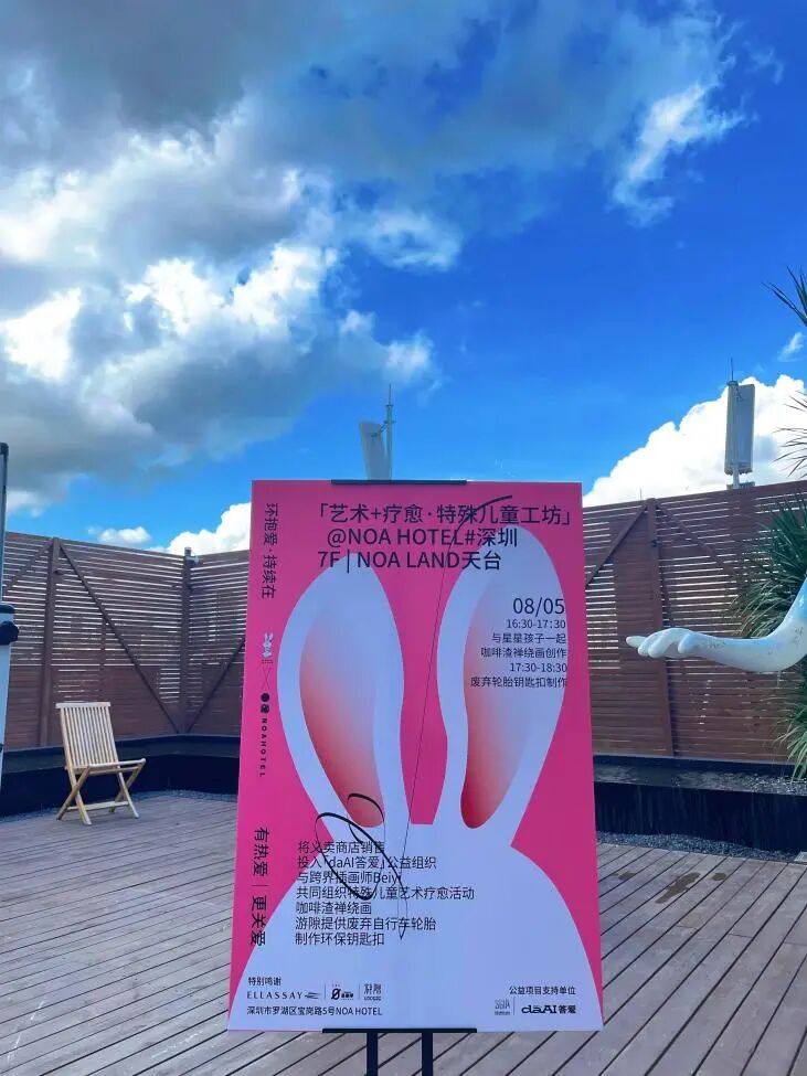 由深圳市服装行业协会创立的「daAI答爱」基金也加入NOA 、陈碧舸,以“可持续”为枢纽,与来自“衣”“食”“住”“行”“四个生活领域的深圳品牌代表共同发起系列活动「环抱爱 持续在」;通过旧物循环,行业论坛的可持续、环保实践义卖商店、再生设计,巡演展览等慈善活动募集捐款,形成收益转化,将所有商品的销售所得(税后)付诸公益,最终借由这些善款得以促成8月5日 的艺术+疗愈·特殊儿童工坊。