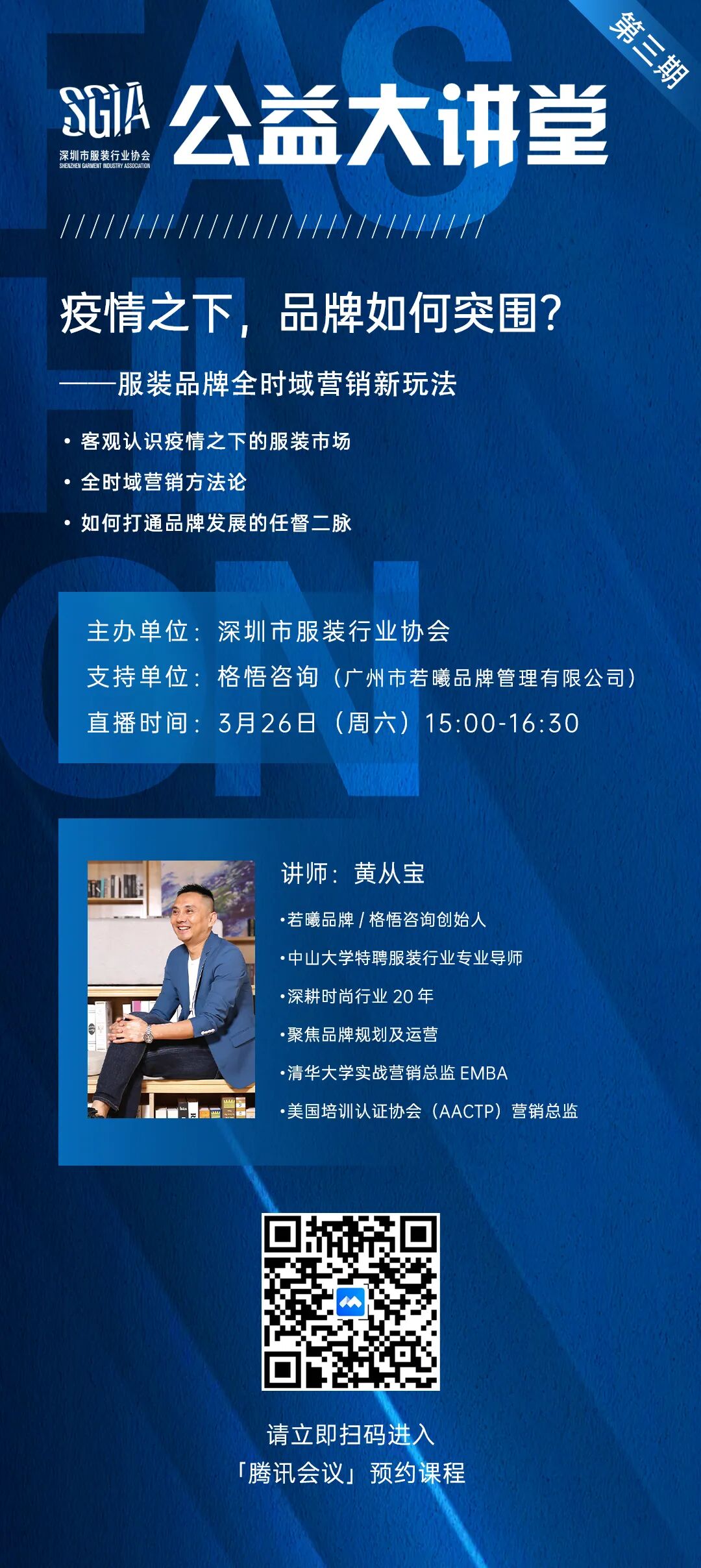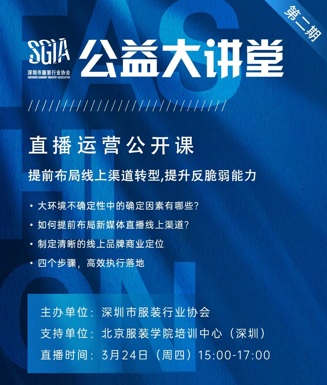 深服协公益大讲堂是由深圳市服装行业协会于2022年发起,以时尚企业及品牌当下发展机遇与挑战为出发点,联合并组织国内外时尚行业各领域专家教授、顶级学者、专业大咖等资深人士,面向时尚行业从业人员开展的专业公益课程。助力企业可持续发展,拥抱新变化、面对新挑战,迸发出新的活力与潜力,积极为深圳时尚产业升级赋能。