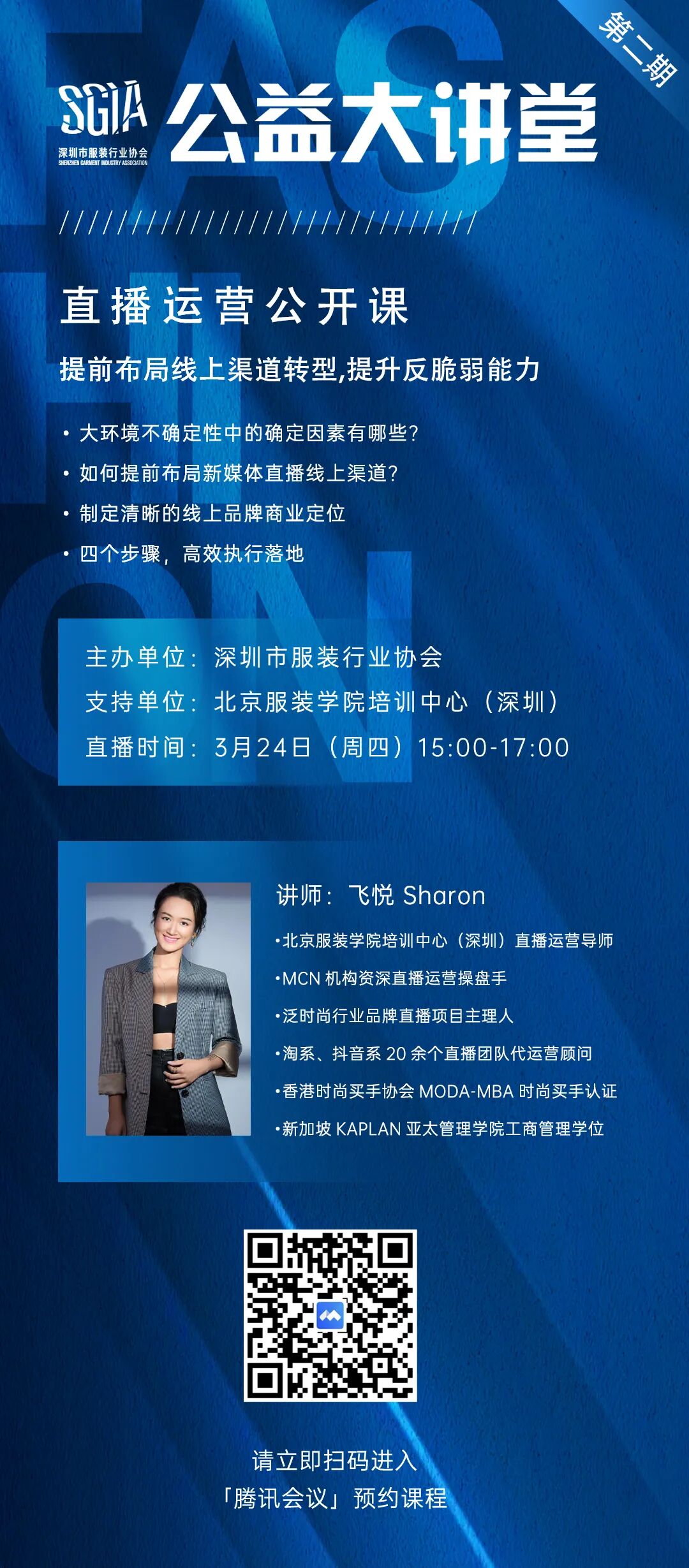 3月20日,由深圳市服装行业协会公益大讲堂第一期在线上开讲,北京服装学院培训中心(深圳)作为支持单位,邀请了北京服装学院培训中心(深圳)时尚零售导师、时尚零售营销经体系创建者祁翔讲师进行免费授课,吸引超200名时尚行业从业人员线上观课及互动。