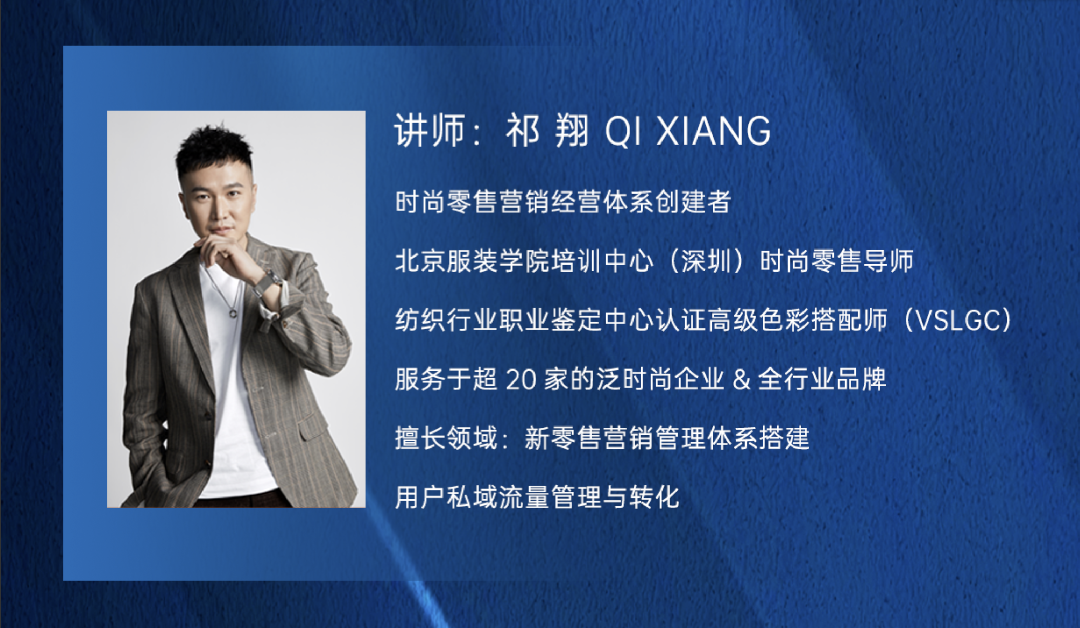 祁翔老师多年服务于超20家的泛时尚企业&全行业品牌,在新零售营销管理体系搭建、用户私域流量管理与转化、店铺精细化运营标准构建等领域具有丰富的操盘运营与教学实践经验。