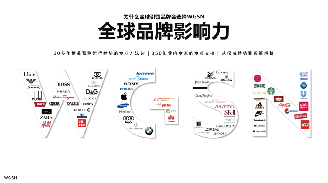 WGSN是权威的趋势预测机构,1998年在英国伦敦成立,立足于全球趋势洞察、专业数据和行业分析,帮助品牌把握机遇,释放潜力,创造未来。