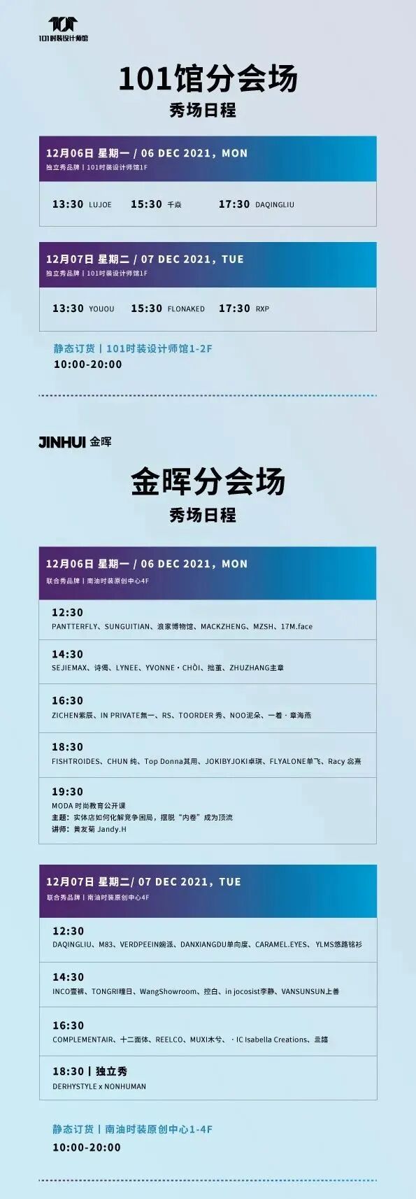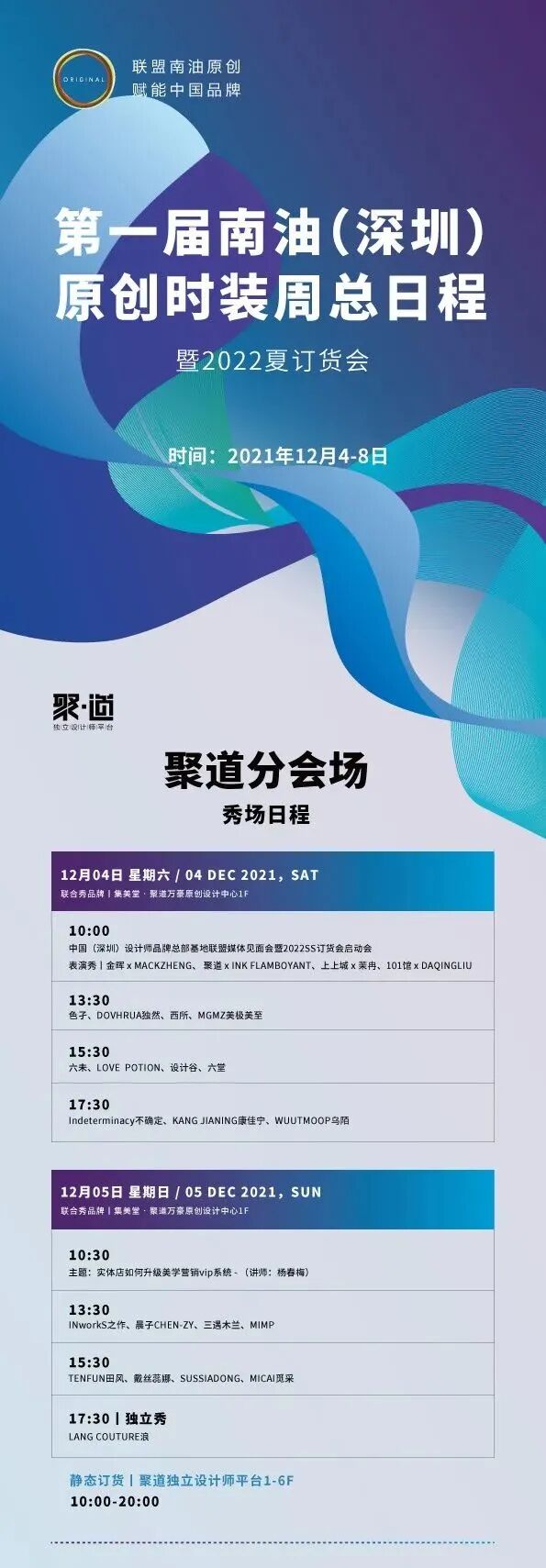 2022春夏南油原创时装周将于2021年12月4日拉开序幕,为期五天,超500家实力设计师品牌2022春夏新品静态展、70+品牌动态发布秀,数量之庞大、风格之丰富堪称南油之最。会场还将举办2022春夏订货会,看秀、订货两不误!