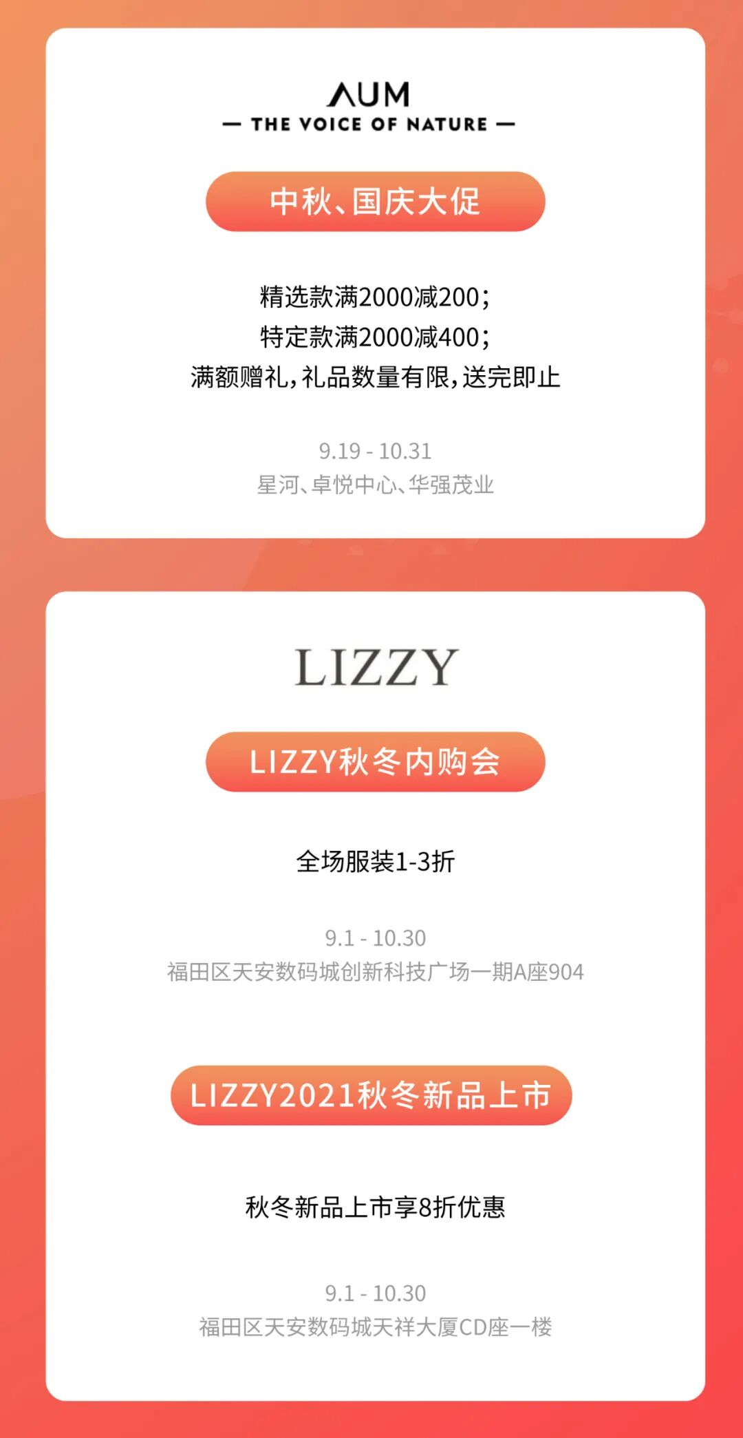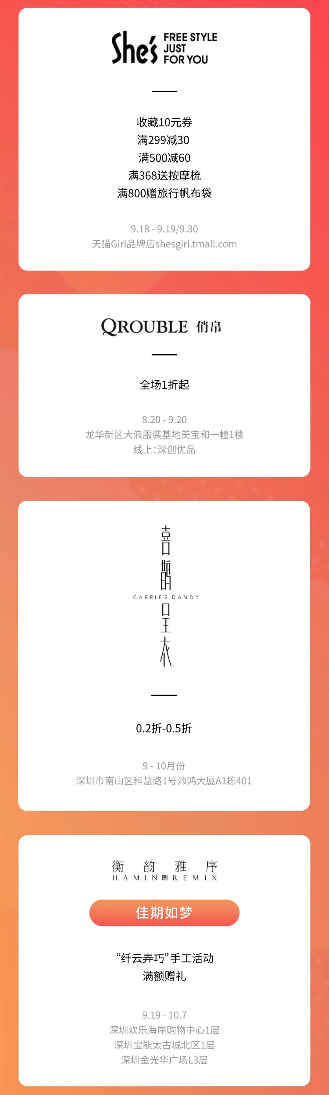 深圳时尚消费节是深圳购物季系列活动之一,深圳市服装行业协会作为该活动的主办方,组织AUM、LIZZY、adbo、She's Girl、俏帛、喜鹊、衡韵雅序、阔太、鲁遇、娅奴、名盾、玮言等深圳及国际服装品牌,与大浪时尚小镇及其它地区商场同期打折,打造全城联动新购物模式,超多品牌带来心动折扣,更有十月底的深圳时装周带来更多活动亮点,let’s 购!