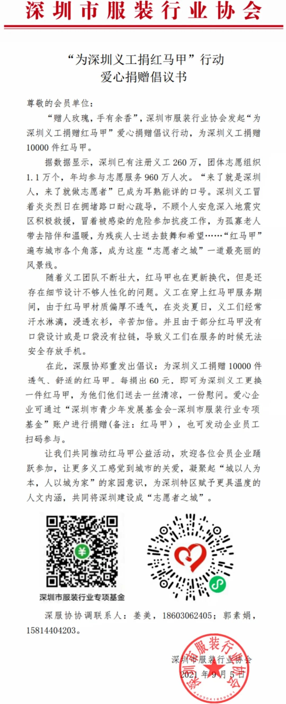 深圳市服装行业专项基金于七月中旬发起“为深圳义工捐红马甲”公益项目,反哺红马甲志愿者的点滴爱心。