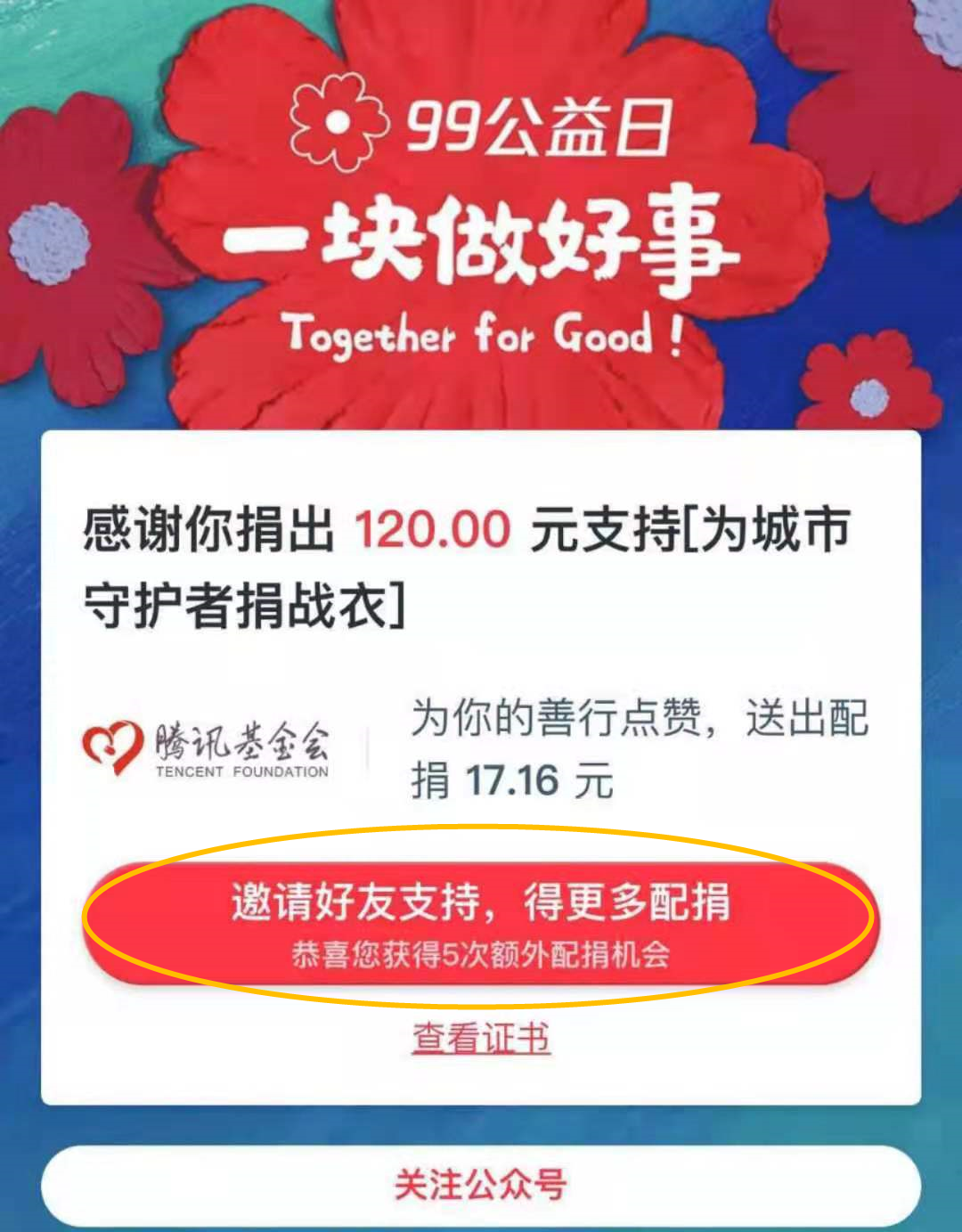 此外,捐赠用户邀请好友助力并且该好友完成至少一项:通过助力页面捐赠不低于1元、完成公益知识问答、赠送小红花,该用户捐赠的公益项目即有机会获得腾讯基金会提供的随机金额的腾讯助力配捐。活动期间,每人每天可获配捐总额最高为999元。腾讯基金会每日配捐资金配完即止,当日未配完资金顺延至活动结束。