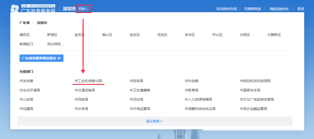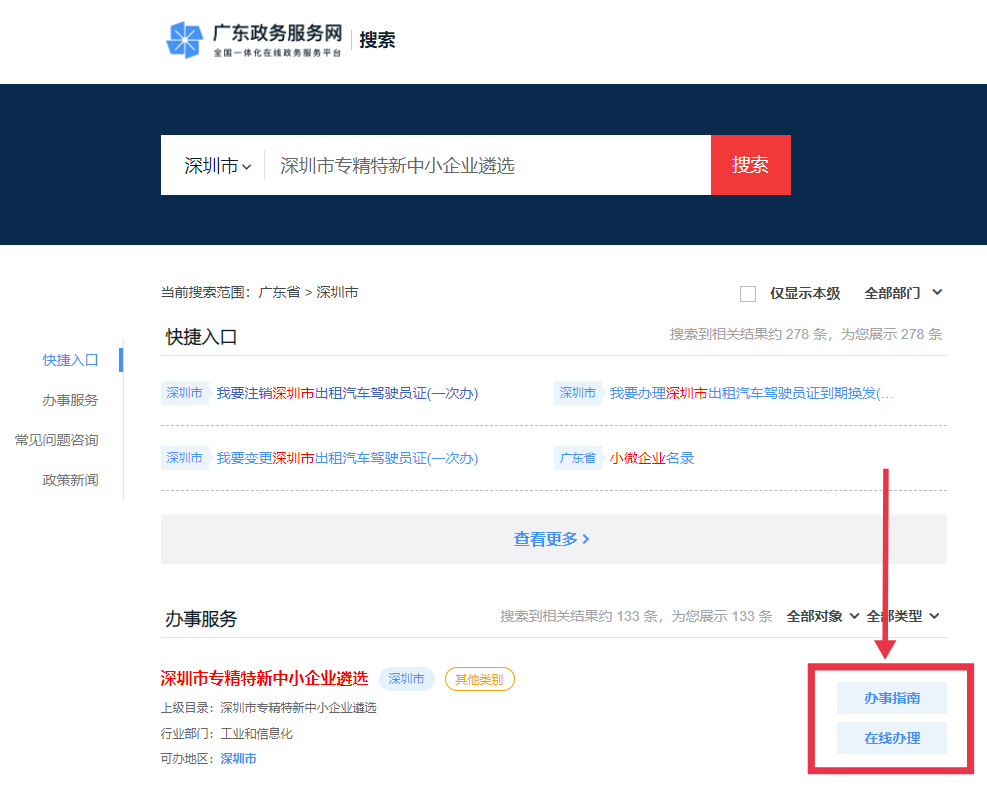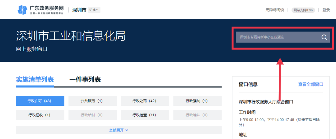 2.登录广东政务服务网——深圳市——市工业和信息化局——搜索申报事项名称“深圳市专精特新中小企业遴选”,选择“深圳市专精特新中小企业遴选”事项办理申请。