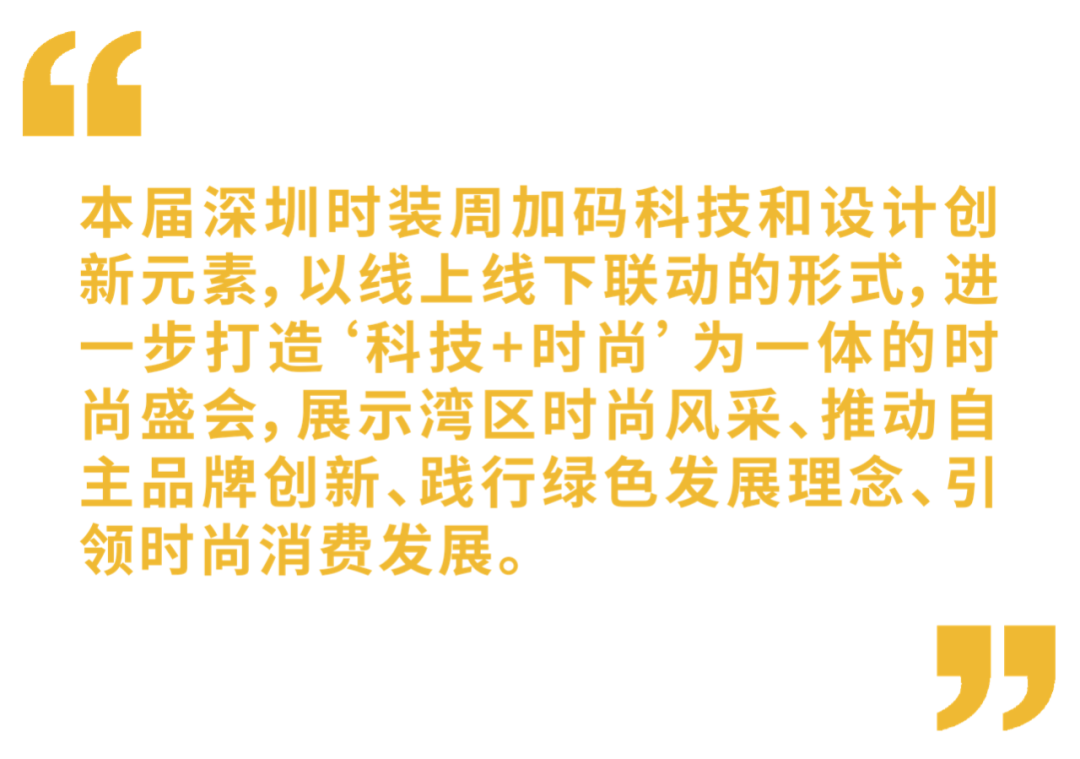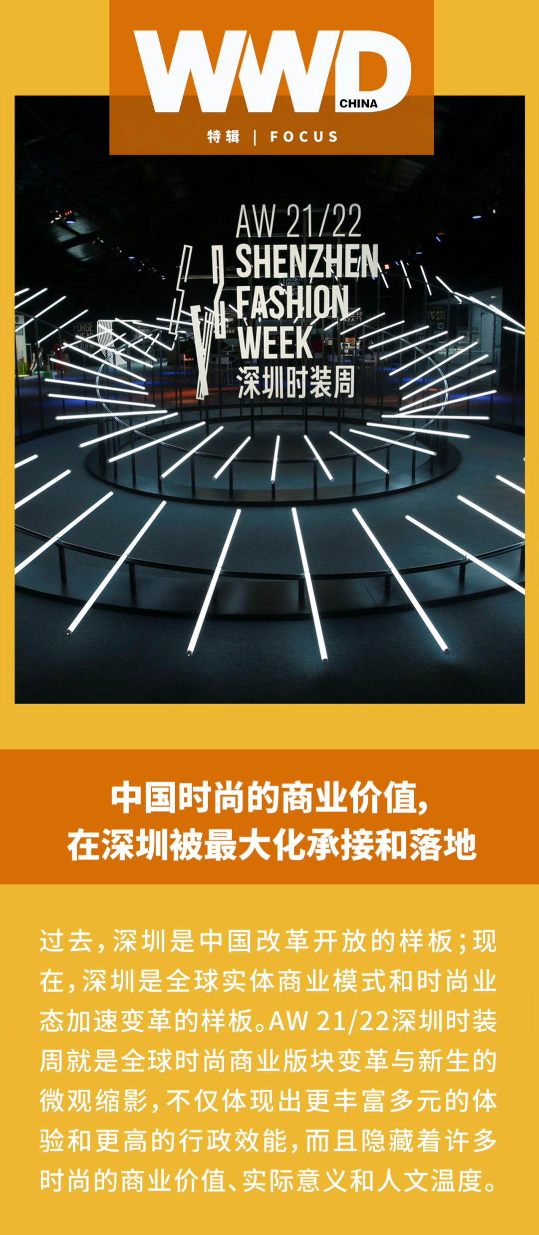 如深圳市服装行业协会会长潘明在总结 AW 21/22 深圳时装周时所说:“本届深圳时装周加码科技和设计创新元素,以线上线下联动的形式,进一步打造‘科技+时尚’为一体的时尚盛会,展示湾区时尚风采、推动自主品牌创新、践行绿色发展理念、引领时尚消费发展,推动时尚产业高质量发展,进一步提升城市时尚文化与人文价值软实力,助力具有全球影响力的创新创业创意之都建设。”