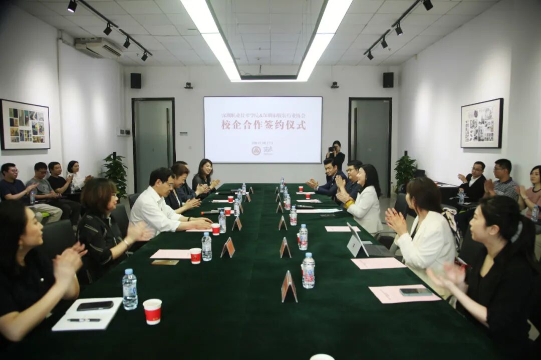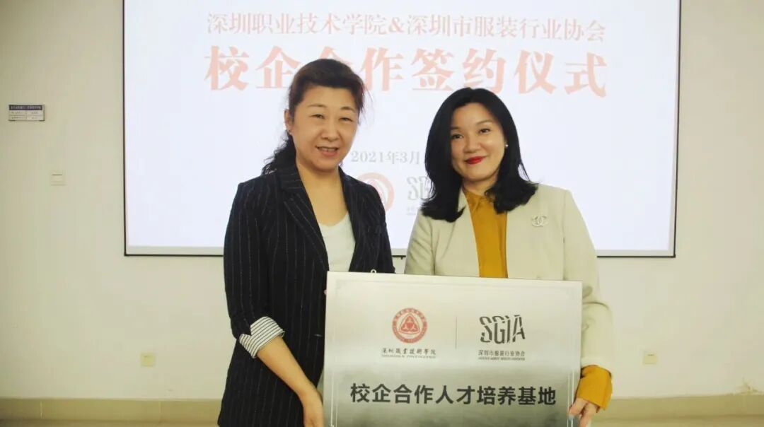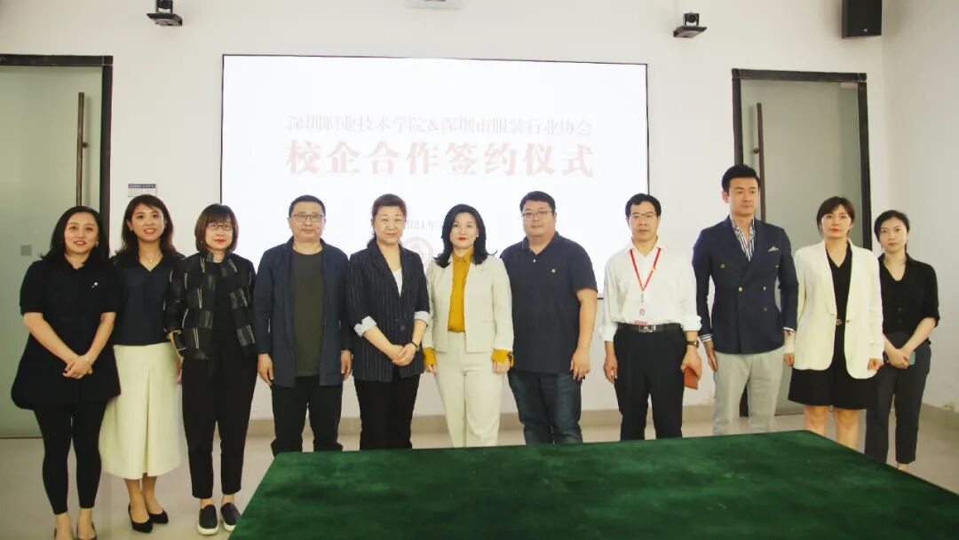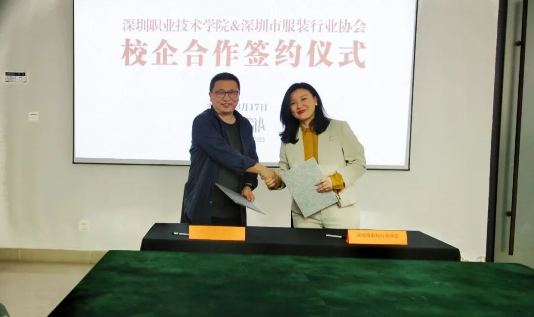 3月17日下午,在深圳职业技术学院知行园五楼会议室,该院艺术设计学院院长帅斌与深圳市服装行业协会会长潘明正式签署校企合作协议,深职院党委副书记、纪委书记王慧为深服协授予“校企合作人才培养基地”牌匾。