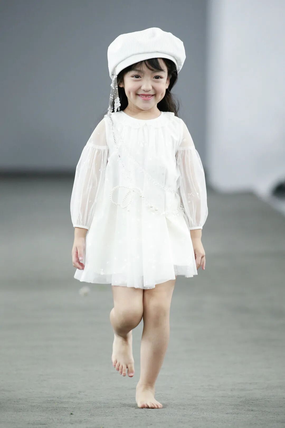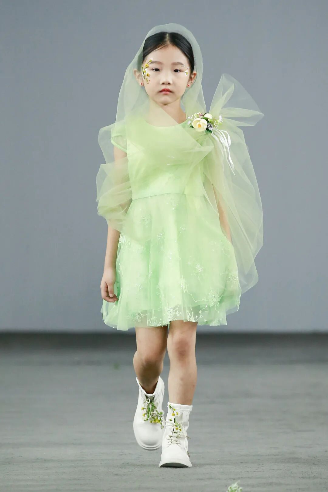 小舞蹈演员穿着一袭雪白公主裙带来开场舞,随后在欢快的音乐和明亮的灯光下,一个个小模特洋溢着纯真的笑容,踏着音乐的拍子缓缓走上舞台。珍珠花瓣、树枝头饰、绿草雏菊……一切与自然相关的元素装饰在服装上、描画在小模特的脸上,展现出生命的活力,更传递出生活的希望和对美好未来的向往。