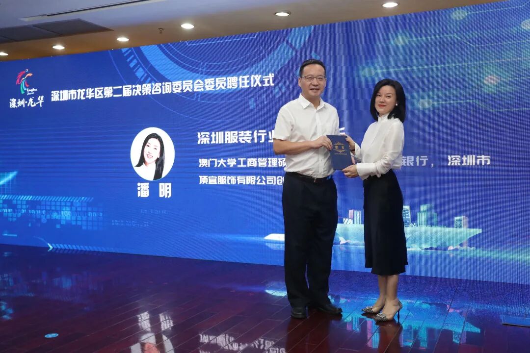 龙华区委书记、区长王卫为深圳市服装行业协会会长潘明颁发专家聘书