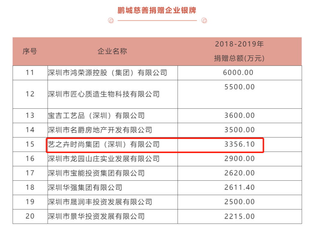 9月19日上午,在第八届中国公益慈善项目交流展示会上,“第五届鹏城慈善奖暨2019年深圳慈善捐赠榜发布会”在深圳会展中心梅花厅举行,共有119个个人、企业、机构和项目获得殊荣。其中,艺之卉时尚集团(深圳)有限公司以3356.1万元的捐赠总额荣获“鹏城慈善捐赠企业银牌”。