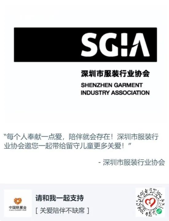深圳市服装行业协会积极参与支持本次“关爱陪伴不缺席”99公益项目,呼吁广大会员企业、热爱公益的服装人一起献出爱心,为广西壮族自治区贺州市沙田镇25个村留守儿童和空巢老人提供关爱陪伴服务。