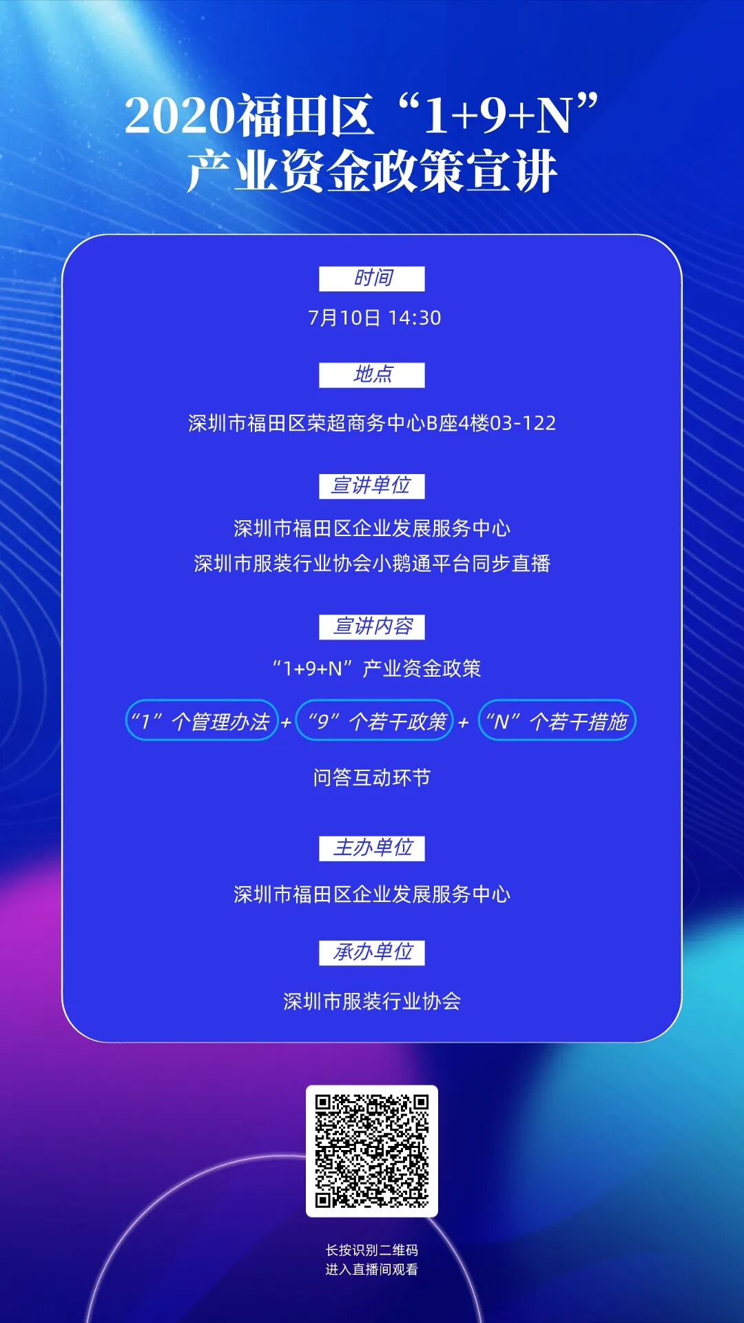在福田区政府及各部门领导的大力支持下,深圳市服装行业协会届时将邀请福田区企业发展服务中心相关领导,线上线下同步开展2020福田区“1+9+N”产业资金政策宣讲,欢迎大家准时关注观看。