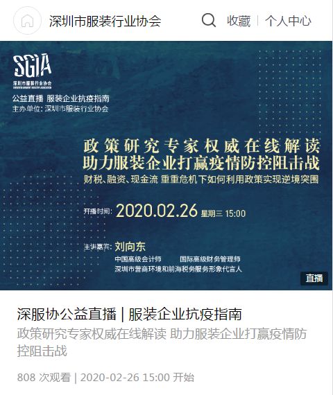 2月26日,由深圳市服装行业协会主办的公益直播系列《服装企业抗疫指南》正式上线,主邀请政府、金融、企业管理等各方专家在线解读,帮助服装企业共渡难关,并把握经济发展潮流动向,实现逆境突围。