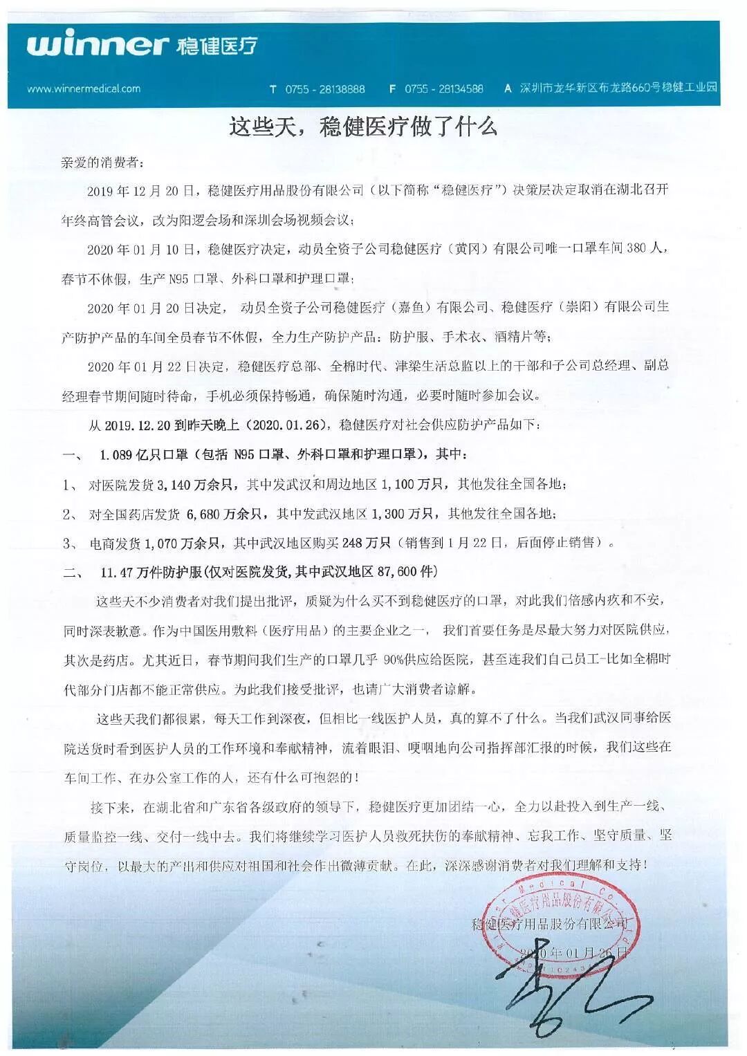 应深圳市政府的部署,作为中国医用敷料行业的龙头企业,全棉时代母公司暨稳健医疗用品股份有限公司(简称“稳健医疗”)从2019年12月20日到2020年1月26日共生产了1.089亿只口罩(包括N95口罩、外科口罩和护理口罩),其中对医院发货3,140万余只,其中发武汉和周边地区1,100万只;共生产11.47万件防护服,向武汉地区医院发货8.76万件。