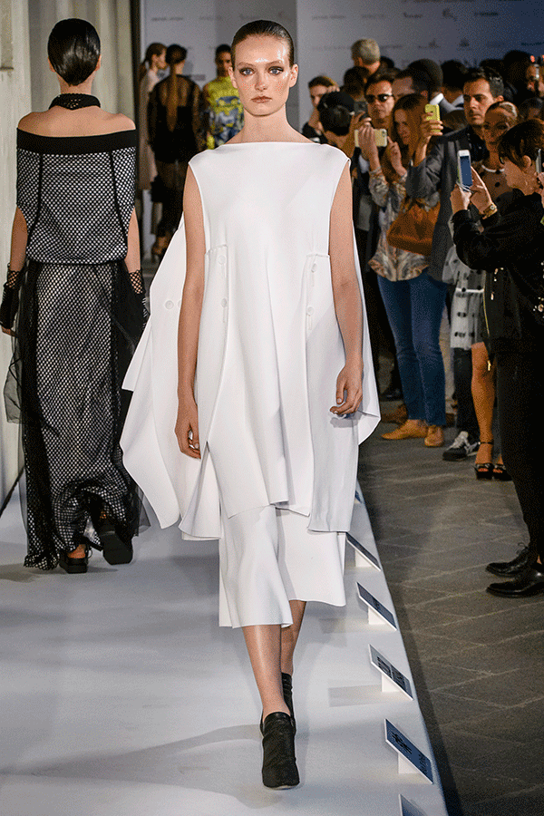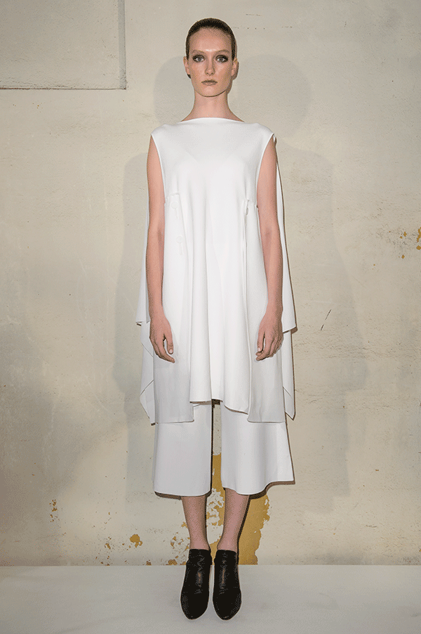 运用其刺穿的洞和切割的直线为设计元素,突出强调其系列的立体及空间感,围裹成型,一个立体空间覆在人体上,强调其纱线本身的特性凸显出挺括的廓形感,同时系列中两穿式的不同着装表现出不同的视觉效果。17春夏设计旨在营造时尚感的同时强调立体感、空间港、和层次感。