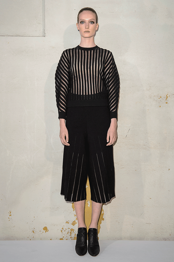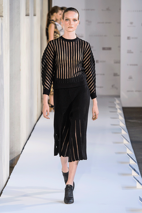 一向平整光洁的定式,以各种各样的材料,如金属纱和透明纱跟织法进行不常规运用,创造出各种肌理效果。应用了现代科技,结合新颖设计思想,创造出独特而不可思议的织片和服装。17春夏通过纹理和褶皱工艺来传递女性精致生活的设计理念。