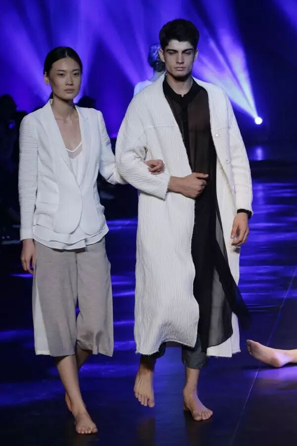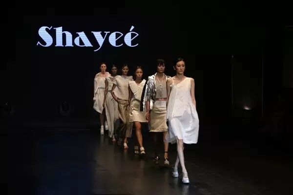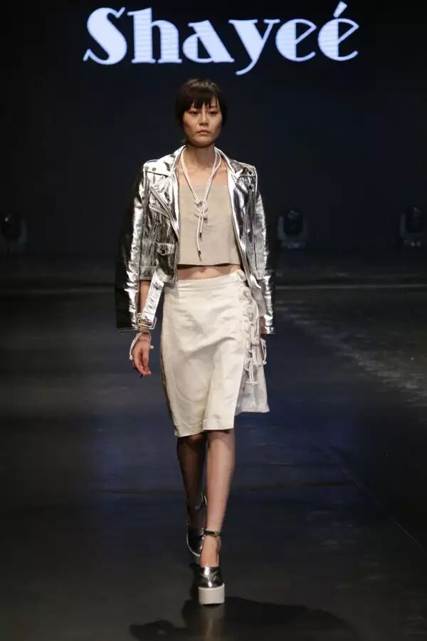 灯光亮起,来自Shayeé(耍衣)品牌创始人王珏伈和姚峣,为大家展示白色之美,结合多种不同柯桥面料的服装系列由白衍生银白、灰,结合别致的白色盘扣作为装饰,帅气登场。