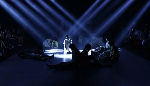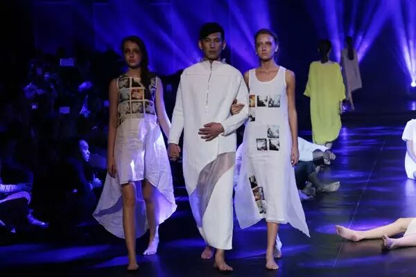 时装秀开始,场内的灯光音乐特效还原了战争现场的枪林弹雨,“人类是带着梦想游走,那个星期三,有一张图片瞬间传遍,那是一位躺在了海滩上的叙利亚小男孩。战争让家庭和生命瞬间的毁灭……”。随着“五叠衣”设计师杨宝志的一段独白,难民风造型的模特在舞台上慢慢苏醒,茫然无措在舞台中行走,一阵阵的海浪声渲染着凄凉,设计师的作品用这种舞台艺术形式在舞台上一一呈现,与剧情容为一体。
