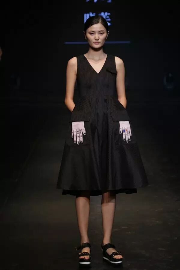 “唐晓芙”品牌创始人白露丹这次带来了名为“手”的时装系列,模特穿着带帽长衫酷帅开场,以黑色调为主,搭配上淡紫色的手印花,长夹克棉麻外套,以及全印花的蓬裙,可以说刚柔兼备。