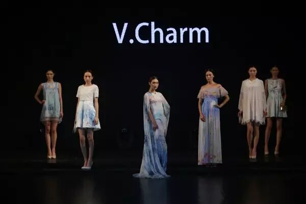 V.Charm创始人刘阳则带来了“天空之境”系列,印花上那精灵般的图案,仿佛把观众立刻带入到茶卡湖畔,仰望天空的蓝白,轻盈而灵动。模特手上戴着的羽毛,随风摆动,轻舞曼妙。