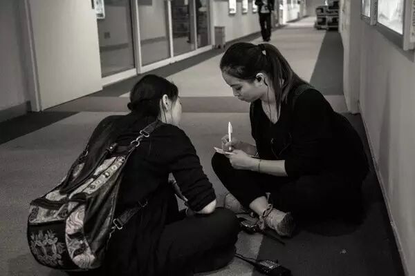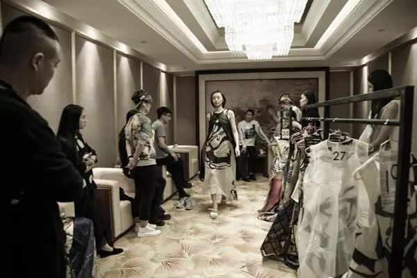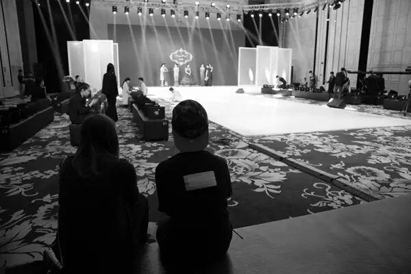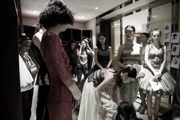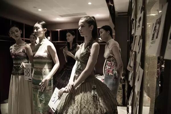 秀场后台,参与设计师谢海平时装发布的模特正在试装准备