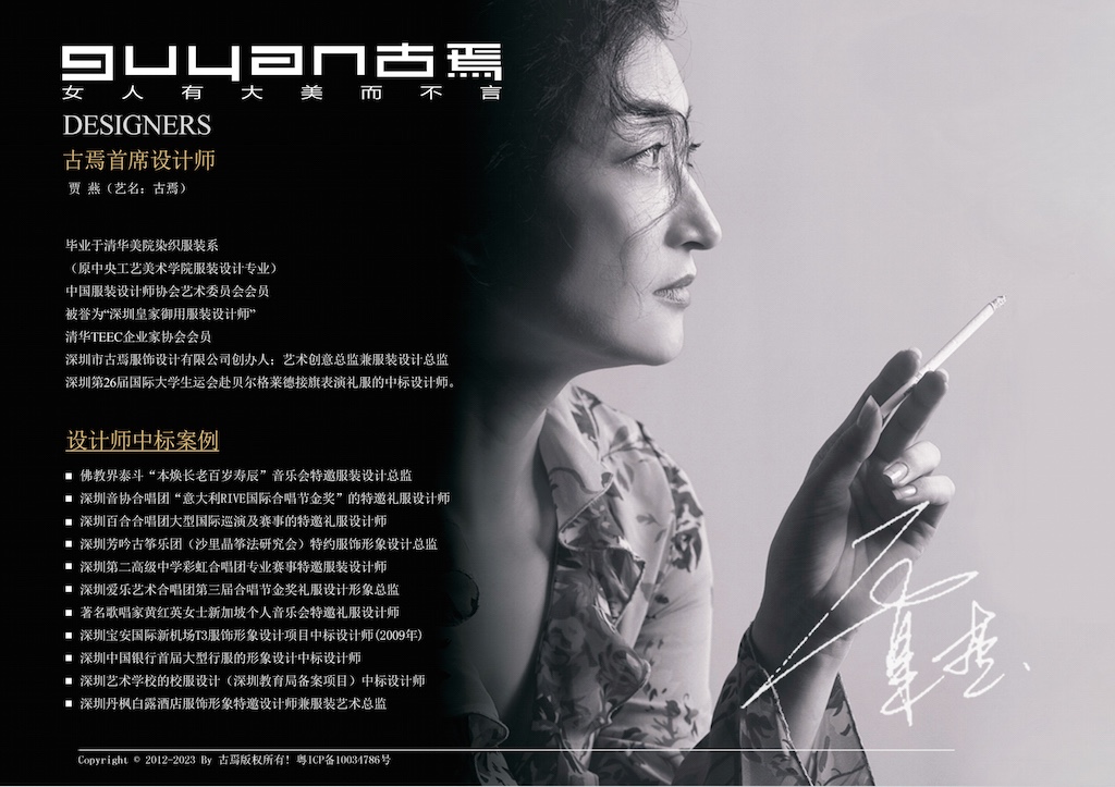 贾燕:毕业于清华美院染织服装系(原中央工艺美术学院服装设计专业),中国服装设计师协会艺术委员会会员,被誉为“深圳皇家御用服装设计师”,清华TEEC企业家协会会员,深圳市服装设计协会副会长,古焉礼服品牌的创始人,深圳市古焉服饰设计有限公司艺术创意总监兼首席服装设计师。由其创立的“guyan古焉”礼服,将“女人有大美而不言”的东方文化作为品牌的理念,创造、挖掘、寻求服装与审美的共识,努力将中国文化礼仪精神和与人们生活息息相关的服饰文化重新定位设计。