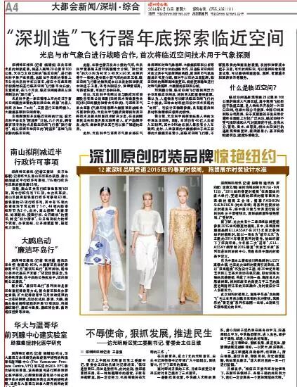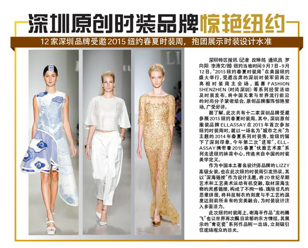据了解,此次共有十二家深圳品牌受邀参展2015纽约春夏时装周。其中,深圳原创服装品牌ELLASSAY在2013年首次参加纽约时装周时,就以一场名为“城市之光”为主题的2014年春夏系列时装秀,给纽约留下了深刻印象。今年第二次“进军”,ELLASSAY携带着2015春夏“优雅艺术家”系列走进纽约林肯中心,传递来自中国的时装美学定义。