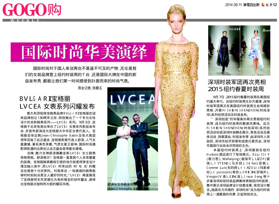 本届纽约时装周上,深圳服装在纽约Hudson酒店进行了现场展示。ELLASSAY(歌力思)、Xiehaiping(谢海平)、LIZZY(丽琪)、KODICE、Séfon(臣枫)、Comme Lun(东的西)、MAXZOLA(玛斯卓拉)、Myscissors(希色)、ORIGIN(安瑞井)、Vmajor(V调)、EIN(言)、Grace Deng等十多家深圳知名时装品牌集体亮相纽约时装周,集中展示深圳品牌设计创意成果、视觉设计概念,独具东方风情的“深圳时尚”成为纽约时装周上一道靓丽的风景,引起特别关注。