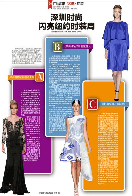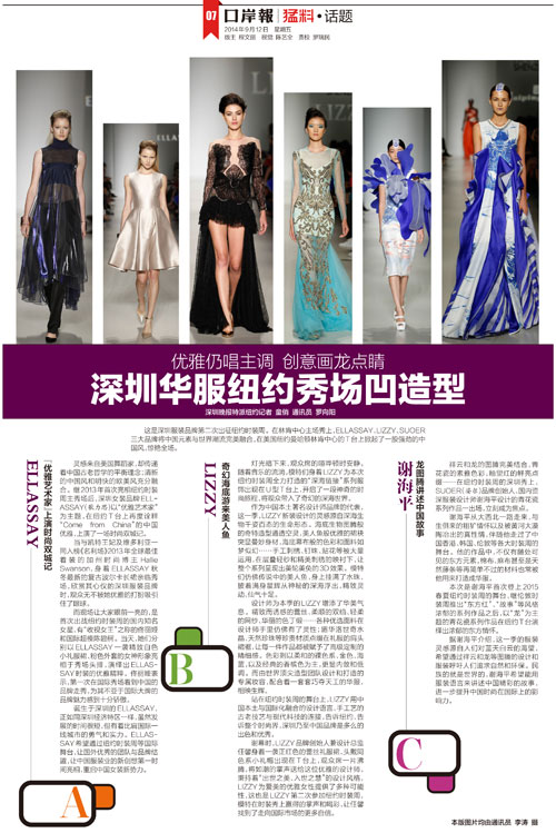 这是深圳服装品牌第二次出征纽约时装周。在林肯中心主场秀上,ELLASSAY、LIZZY、SUOER三大品牌将中国元素与世界潮流完美融合,在美国纽约曼哈顿林肯中心的T台上掀起了一股强劲的中国风,惊艳全场。