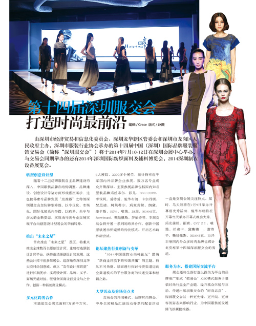 由深圳市经济贸易和信息化委员会、深圳龙华新区管委会和深圳市龙岗区人民政府主办,深圳市服装行业协会承办的第十四届中国(深圳)国际品牌服装服饰交易会(简称“深圳服交会”)将于2014年7月10-12日在深圳会展中心举办,与交易会同期举办的还有2014年深圳国际纺织面料及辅料博览会,2014深圳制衣设备展览会。