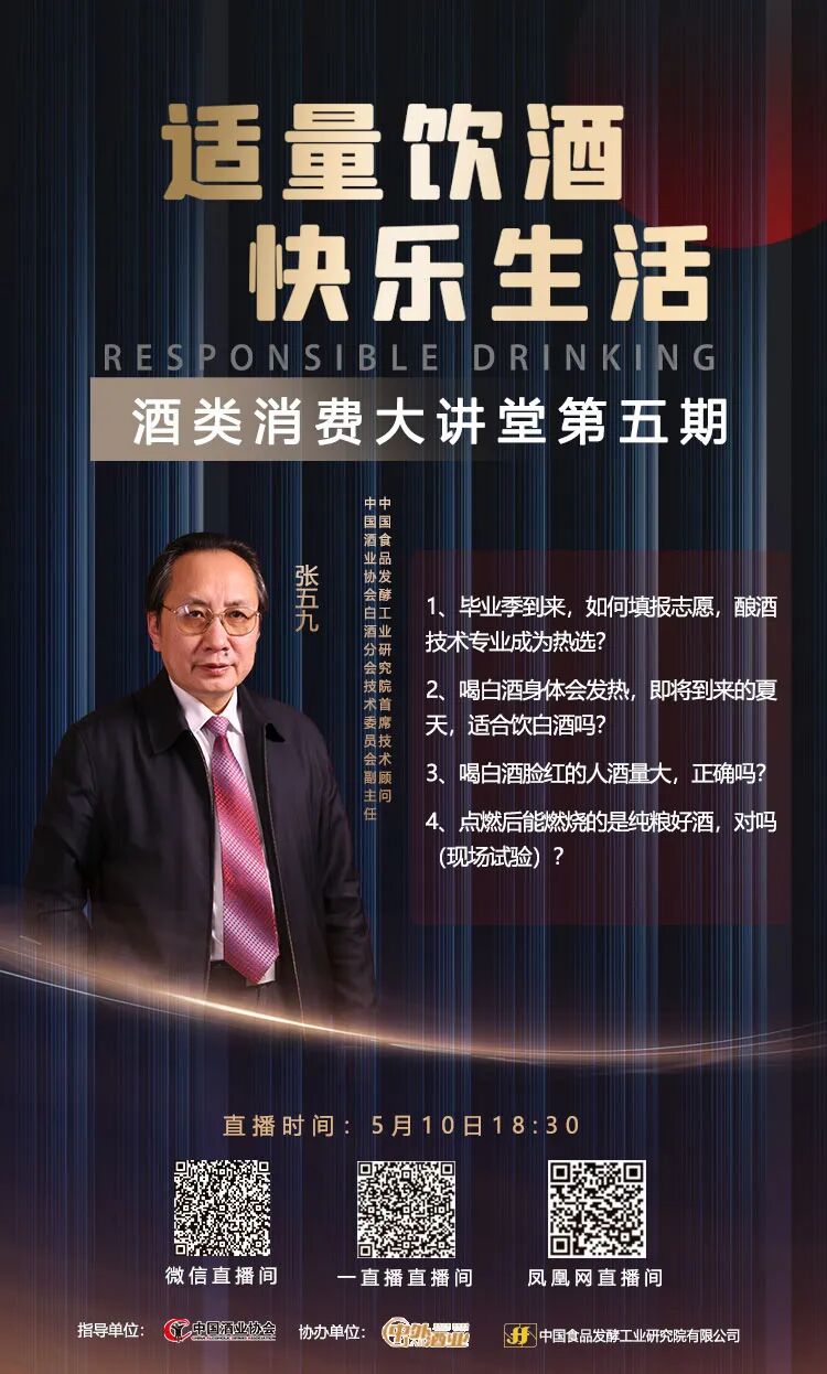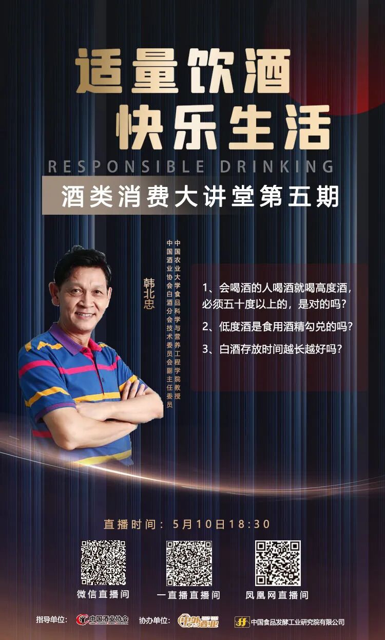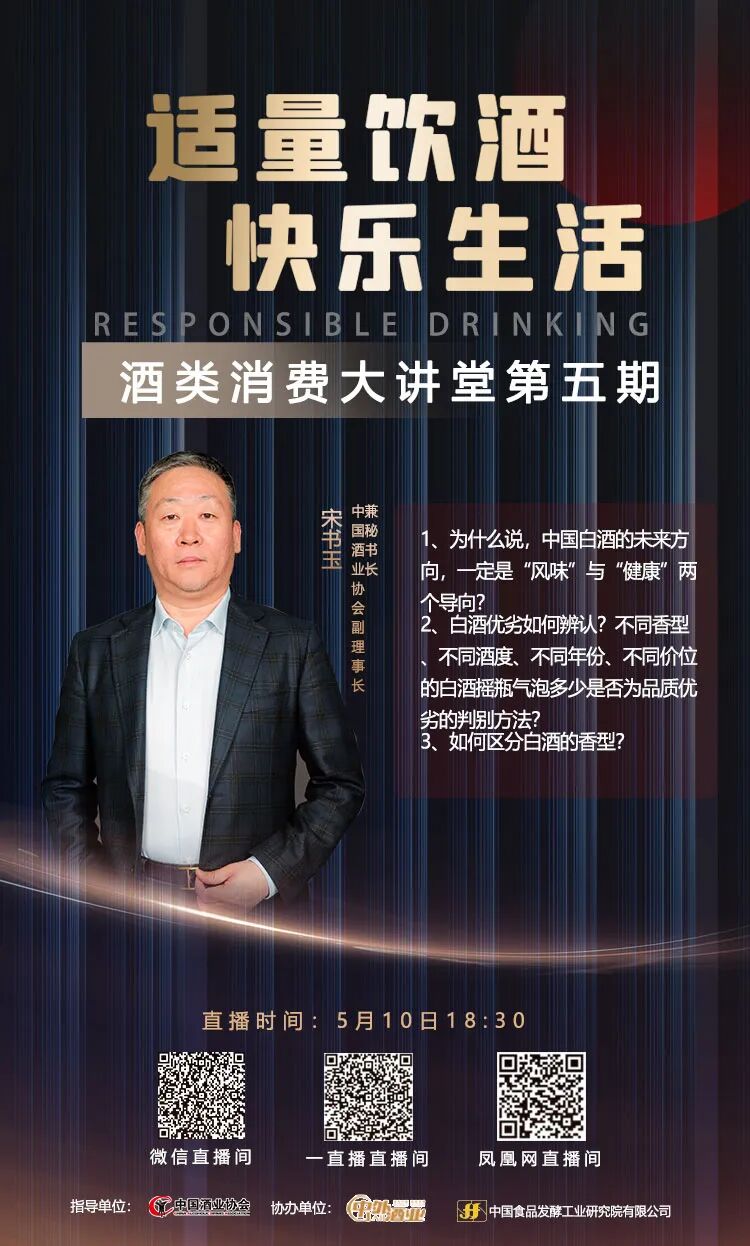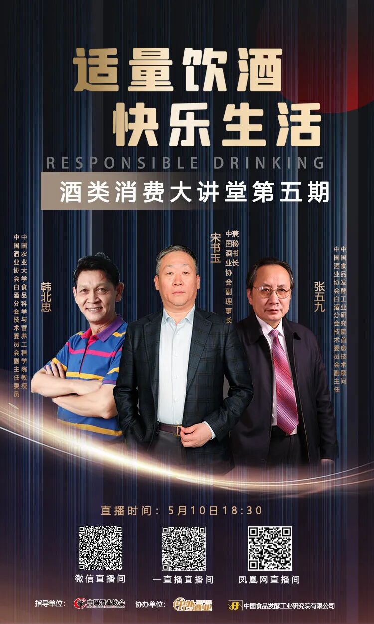 5月10(周日)18:30,“适量饮酒,快乐生活——酒类消费大讲堂”再度开讲,作为“五一节”后第一场科普课堂,此次直播特别邀请到中国酒业协会副理事长兼秘书长宋书玉、中国食品发酵工业研究院首席技术顾问、中国酒业协会白酒分会技术委员会副主任张五九、中国农业大学食品科学与营养工程学院教授、博士生导师、中国酒业协会白酒分会技术委员会副主任韩北忠三位资深专家,就消费者关注的酒类话题,理论结合实验,答疑解惑,分享最权威、最科学、最实用的酒类知识,让你重新认识白酒。