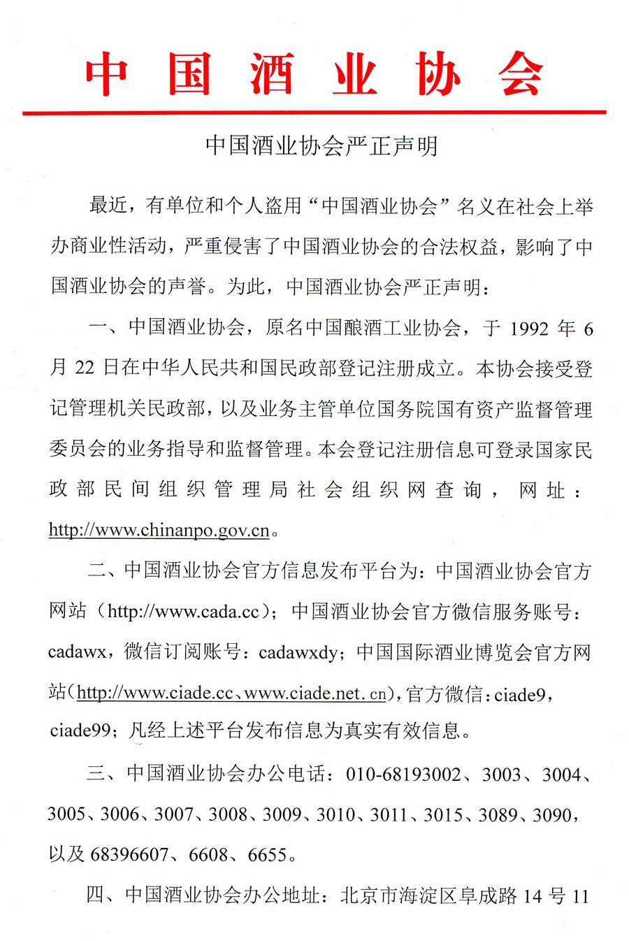 二、中国酒业协会官方信息发布平台为:中国酒业协会官方网站(http://www.cada.cc);中国酒业协会官方微信服务账号:cadawx,微信订阅账号:cadawxdy;中国国际酒业博览会官方网站(http://www.ciade.cc、www.ciade.net.cn),官方微信:ciade9,ciade99;凡经上述平台发布信息为真实有效信息。