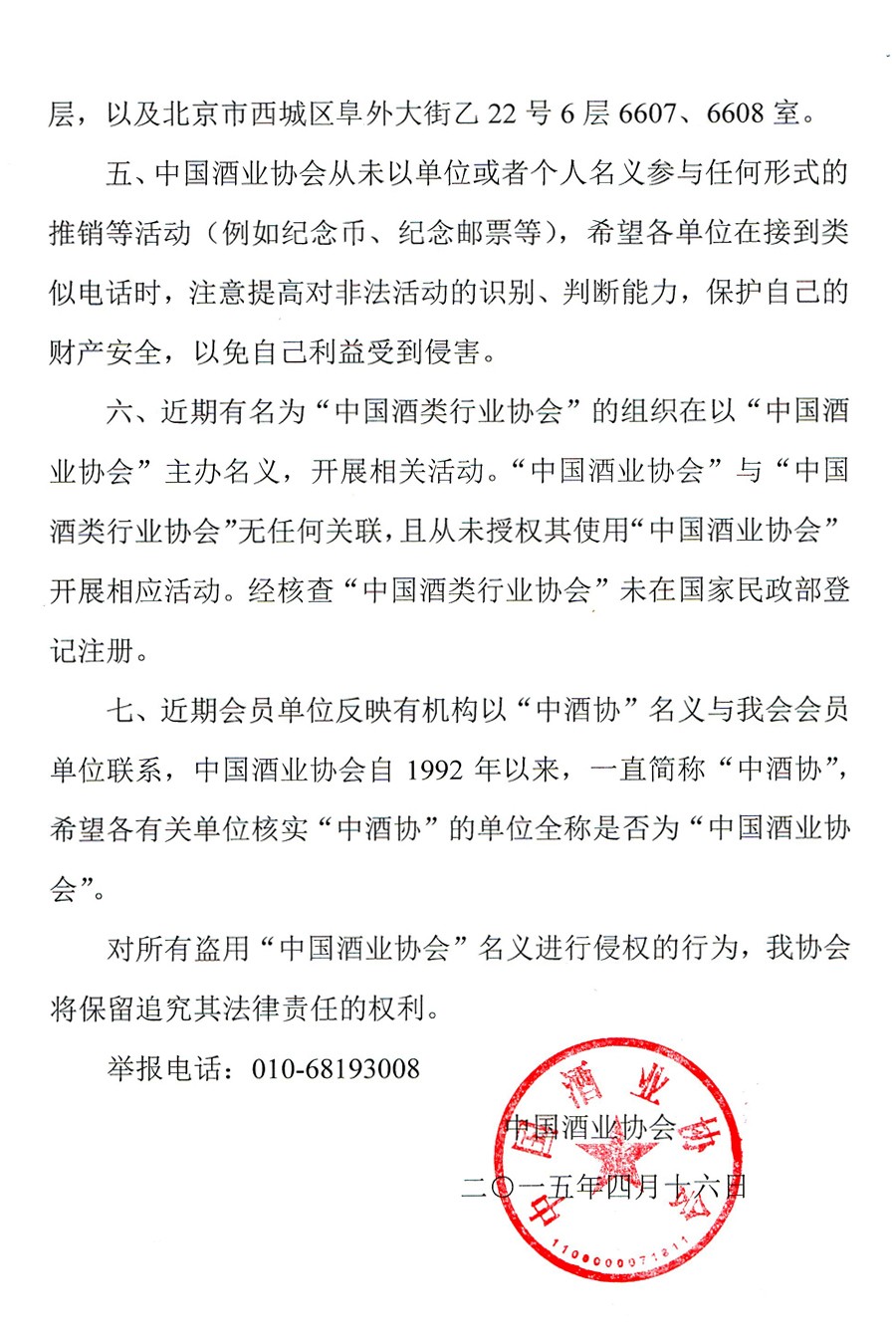 五、中国酒业协会从未以单位或者个人名义参与任何形式的推销等活动(例如纪念币、纪念邮票等),希望各单位在接到类似电话时,注意提高对非法活动的识别、判断能力,保护自己的财产安全,以免自己利益受到侵害。