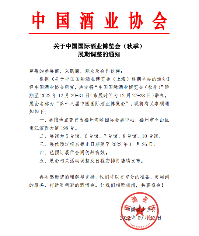 根据《关于中国国际酒业博览会(上海)延期举办的通知》经中国酒业协会研究,决定将“中国国际酒业博览会(秋季)”延期至2022年12月29-31日(布展时间为12月27-28日)举办,展会名称为“第十八届中国国际酒业博览会”,现将有关事项通知如下: