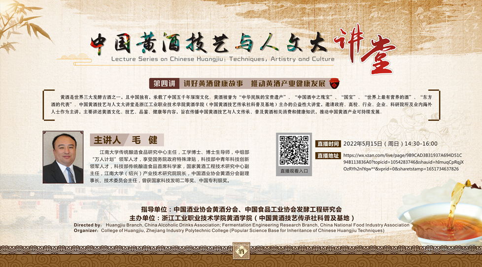 2022年5月15日,由中国酒业协会黄酒分会、中国食品工业协会发酵工程研究会等指导,浙江工业职业技术学院黄酒学院(黄酒文化研究院)、中国黄酒技艺传承社科普及基地主办的“中国黄酒技艺与人文大讲堂”第四讲在广大观众的期待下如期与大家会面,持续受到广大黄酒业海内外人士、黄酒爱好者和消费者的支持收看。
