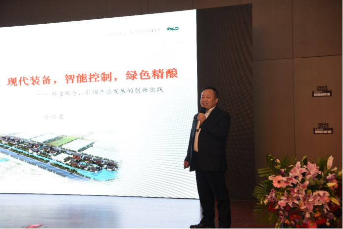 会稽山绍兴酒股份有限公司副董事长、总经理傅祖康就“传统工艺现代装备智能控制绿色精酿”主题发表演讲。他提出智能化黄酒酿造项目实施的目的和意义、实施路径,以及社会经济效益。
